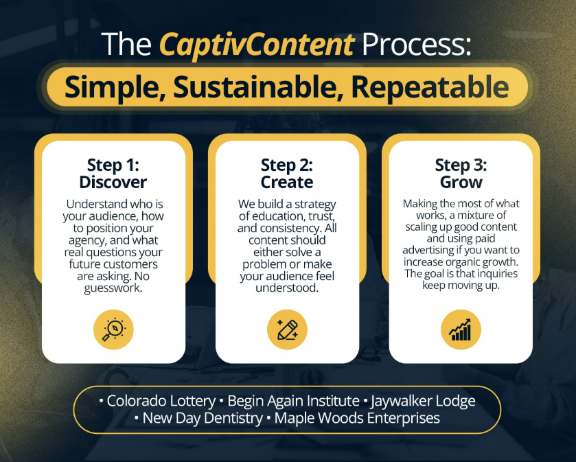 Denver-based, full-service content marketing agency CaptivContent specializes in not just producing content, but building content systems that help the right people find you, understand you, and trust you enough to take action.